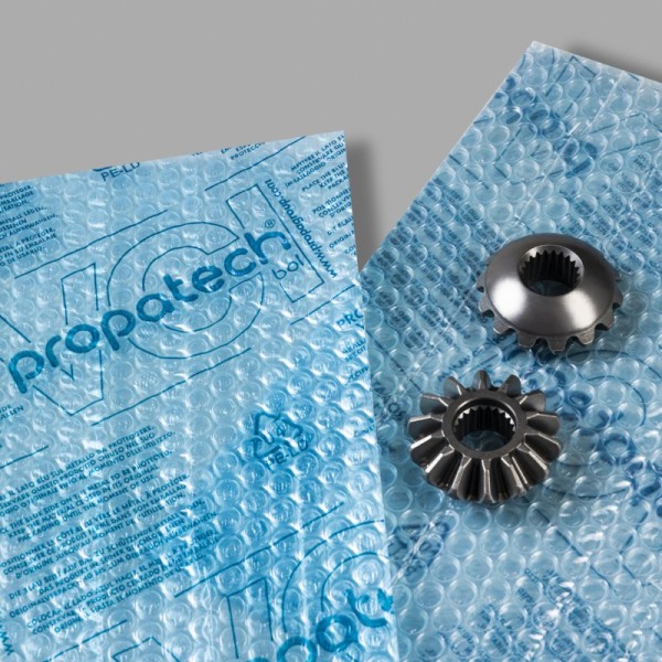 PROPABOL VCI representa una innovación revolucionaria en el sector de la protección industrial, realizado mediante el acoplamiento inteligente del polietileno de burbujas de aire con el PROPATECH VCI FILM aditivado con inhibidor volátil de corrosión. Esta solución única combina tres funciones protectoras fundamentales en un solo material: protección anticorrosiva gracias a las moléculas VCI, protección contra impactos a través del efecto amortiguador de las burbujas de aire, y protección contra rozamientos entre las piezas durante la manipulación. Todo ello manteniendo la completa transparencia que permite el correcto posicionamiento de los productos y facilita las operaciones de control.